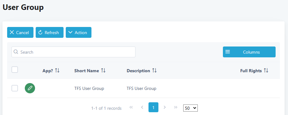 3. Click the Edit button next to the short name of the user group. In this example, TFS User Group.