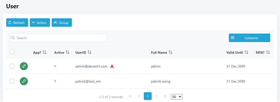 3. Click the Edit button next to the User ID: admin@devent1.com.