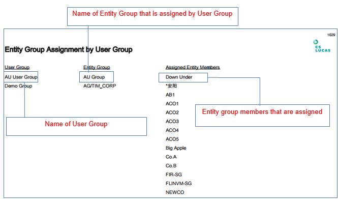 3. The report shows the User group name, Entity Group name and Assigned Entity Members.