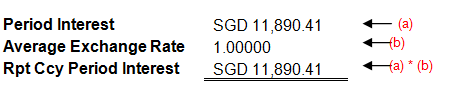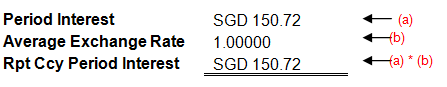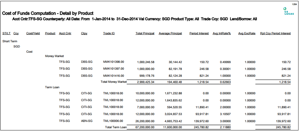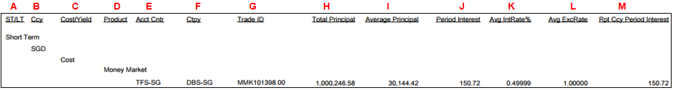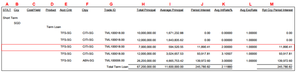 4. The report shows the ST/LT, Ccy, Cost/Yield, Product, Acct Cntr, Ctpy, Trade ID, Total Principal, Average Principal, Period Interest, Avg IntRate%, Avg ExcRate, and Rpt Ccy Period Interest.