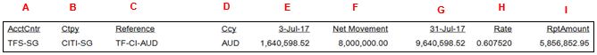 4. The report shows the Accounting Centre, Counterparty, Reference, Currency, From Date, Net Movement, To Date, Rate and Rpt Amount.