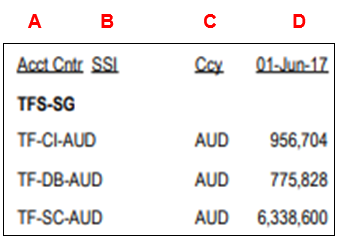 4. The report shows the Accounting Centre, SSI, Currency and Dates based on the selected time bucket (From Example, time bucket selected is for 10 days).