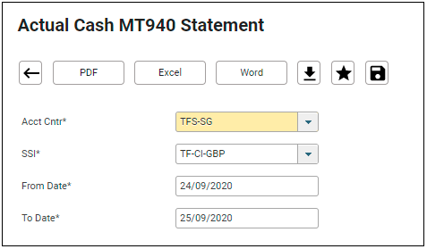 1. Navigate to Reporting > Standard > Report 1431: Actual Cash MT940 Statement.