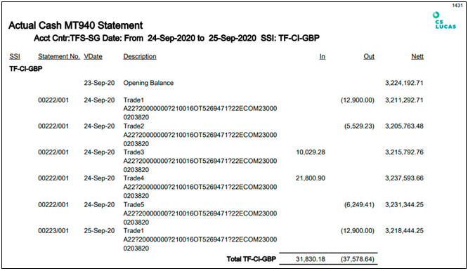 Report 1431 : Actual Cash MT940 Statement (W5)