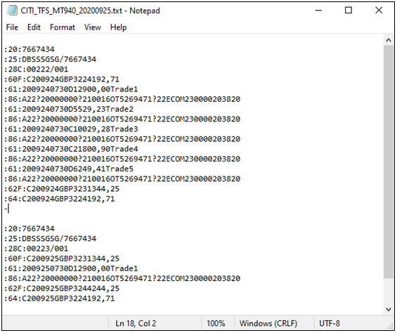 Details of the statements imported are based on the MT940 bank statement file send to CS Lucas. See below for an example of the statement file.