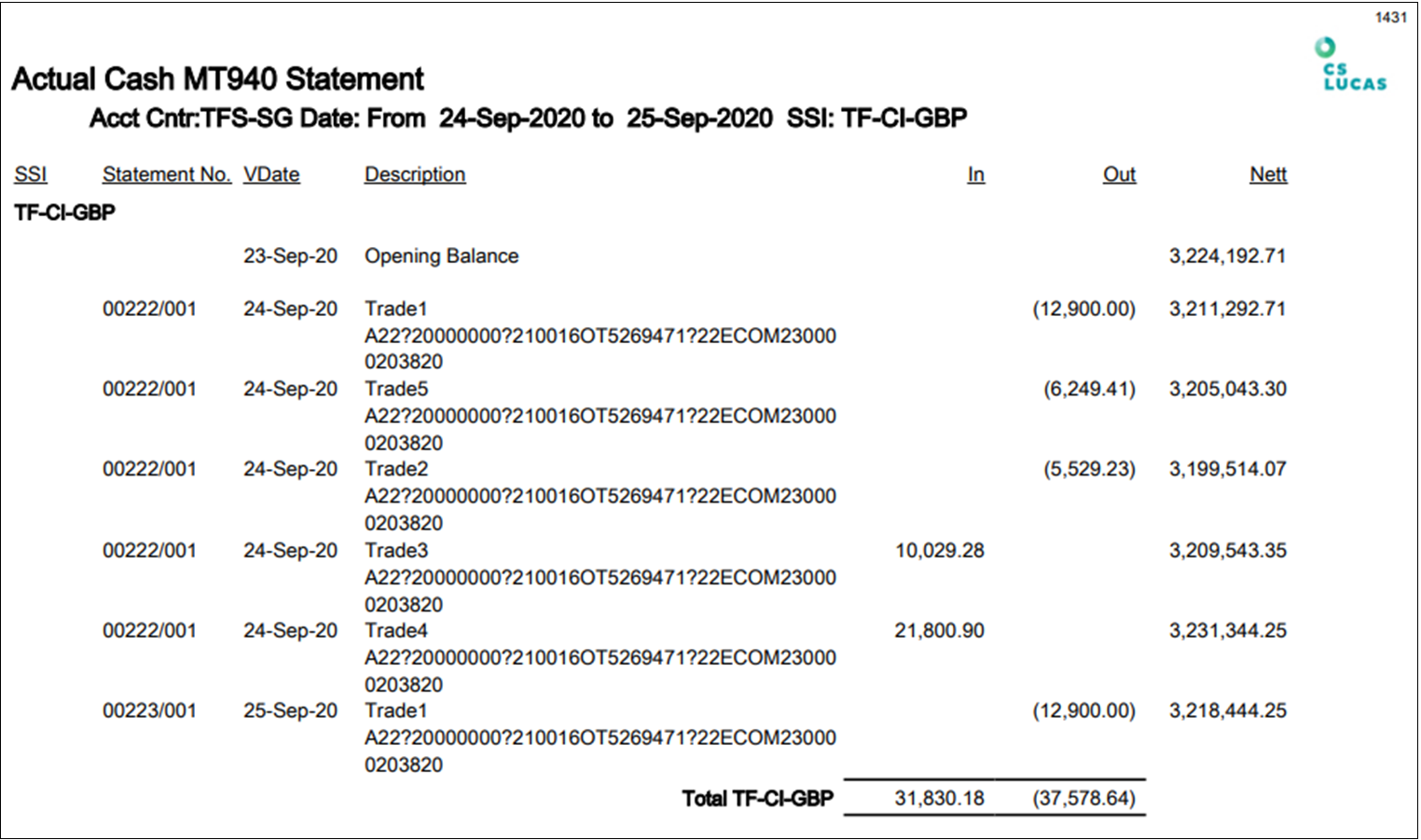 To provide the details used by CS Lucas to show actual cash MT940 statements.