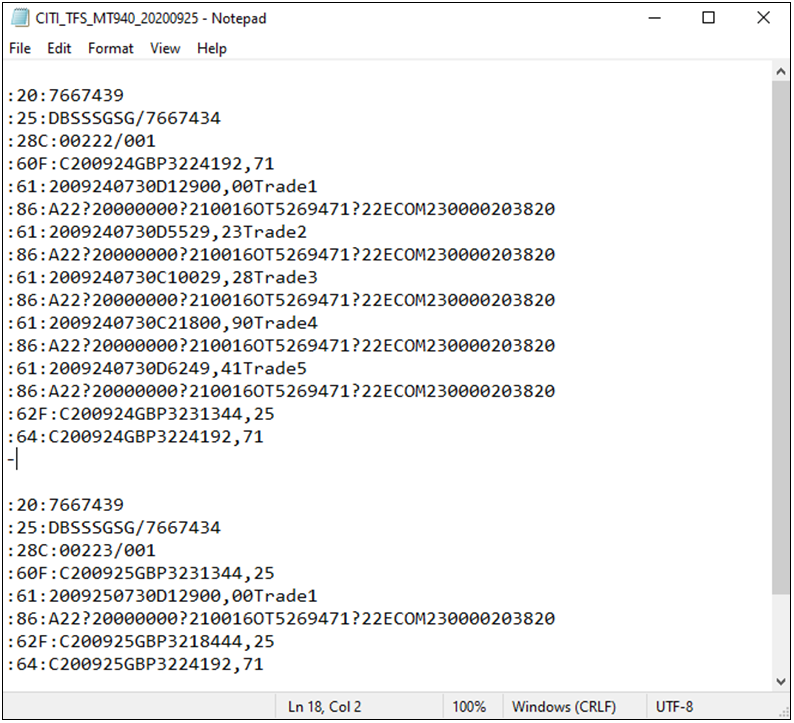 Details of the statements imported are based on the MT940 bank statement file send to CS Lucas. See below for an example of the statement file.