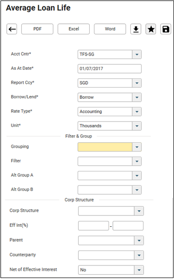 2. Fill in the mandatory parameter – Acct Cntr, As At Date, Report Ccy, Borrow/Lend, Rate Type and Unit.