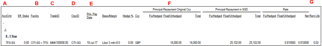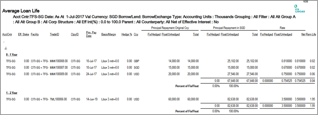 4. The report shows average life of loan transactions. Column fields available on this report are the Accounting Centre, Effective Stake, Facility short name, Trade ID, Counterparty ID, Principal Repay Date, Basis/Margin, Hedge%, Currency, Principal Repayment in the Original Currency – Fix/Hedged, Float/Hedged, Total, Principal Repayment in the reporting currency – Fix/Hedged, Float/Unhedged, Total, Rate – Fix/Hedged, Float/Unhedged, Net and Remaining Life.