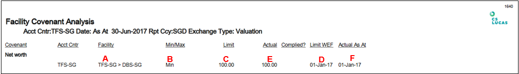 4. The report shows Covenant, Accounting Centre, Facility Short Name, Min/Max, Limit, Actual, Complied?, Limit With Effect Date, Actual As At Date.