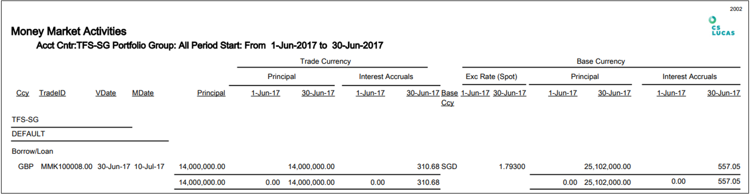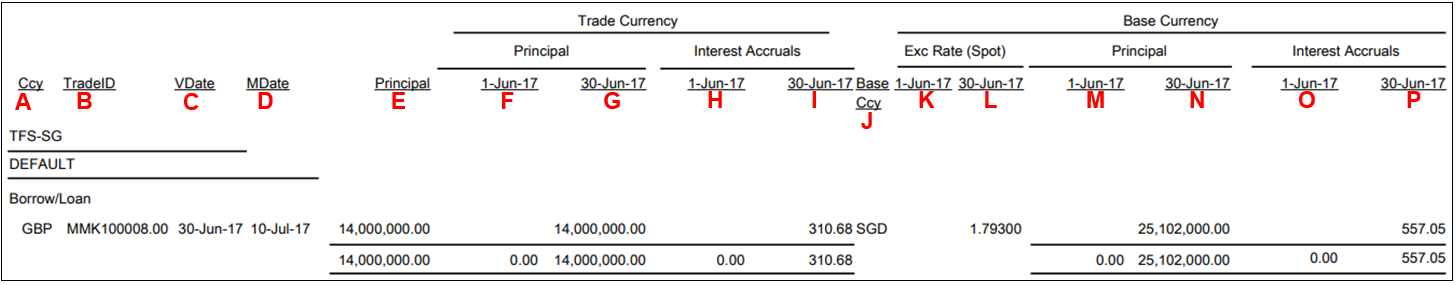 4. The report shows the Currency, Trade ID, VDate, Mdate, Principal, Trade Currency Principal, Interest Accruals and Base Currency Exchange Rate, Principal and Interest Accruals.