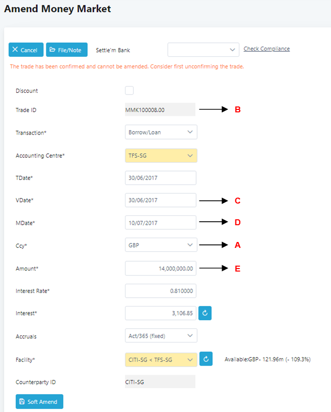5. Click on the Trade ID (From example: MMK100008.00) to drill down to the Amend Money Market screen.
