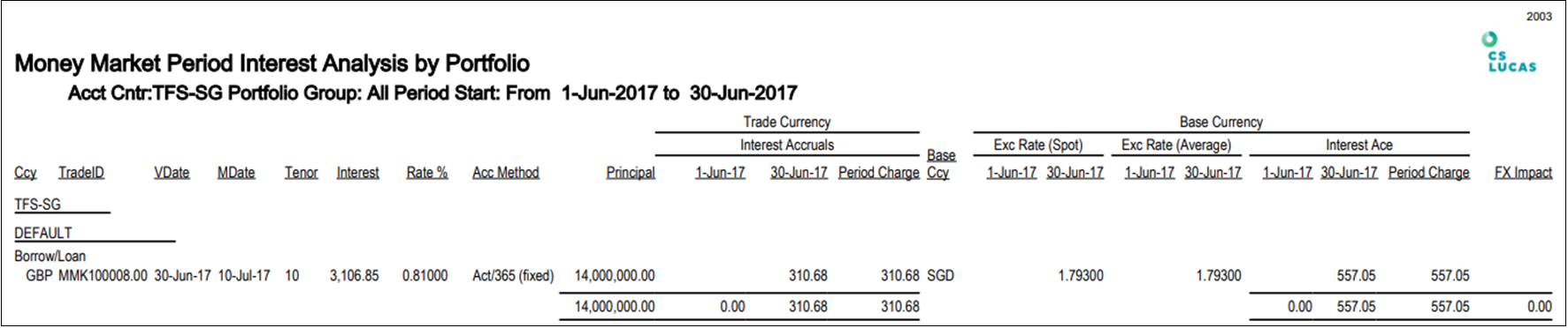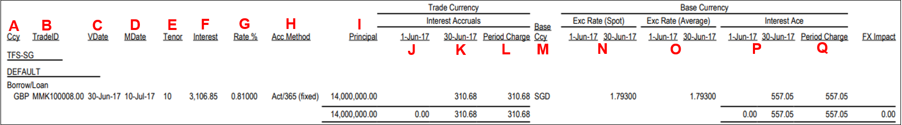 4. The report shows the Currency, Trade ID, VDate, Mdate, Tenor, Interest, Rate %, Acc Method, Principal, Trade Currency Interest Accruals and Base Currency Exchange Rates and Interest Accruals.