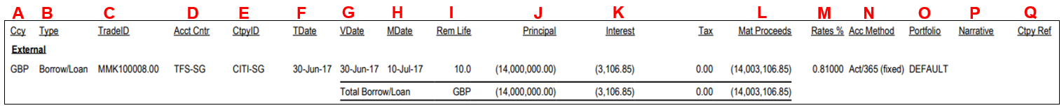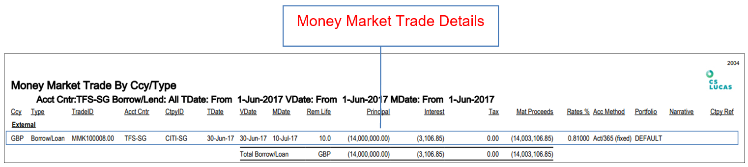 4. The report shows the Currency, Type, TradeID, Accounting Centre, Counterparty ID, TDate, VDate, MDate, Rem Life, Principal (Amount), Interest, Tax, MAT Proceeds (Total Amount with Interest), Rates, Accrual Method, Portfolio, Narrative and Counterparty Reference.