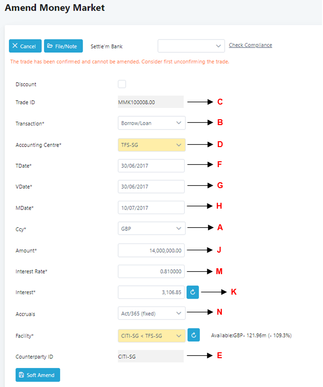 5. Click on the Trade ID (From example: MMK100008.00) to drill down to the Amend Money Market screen.