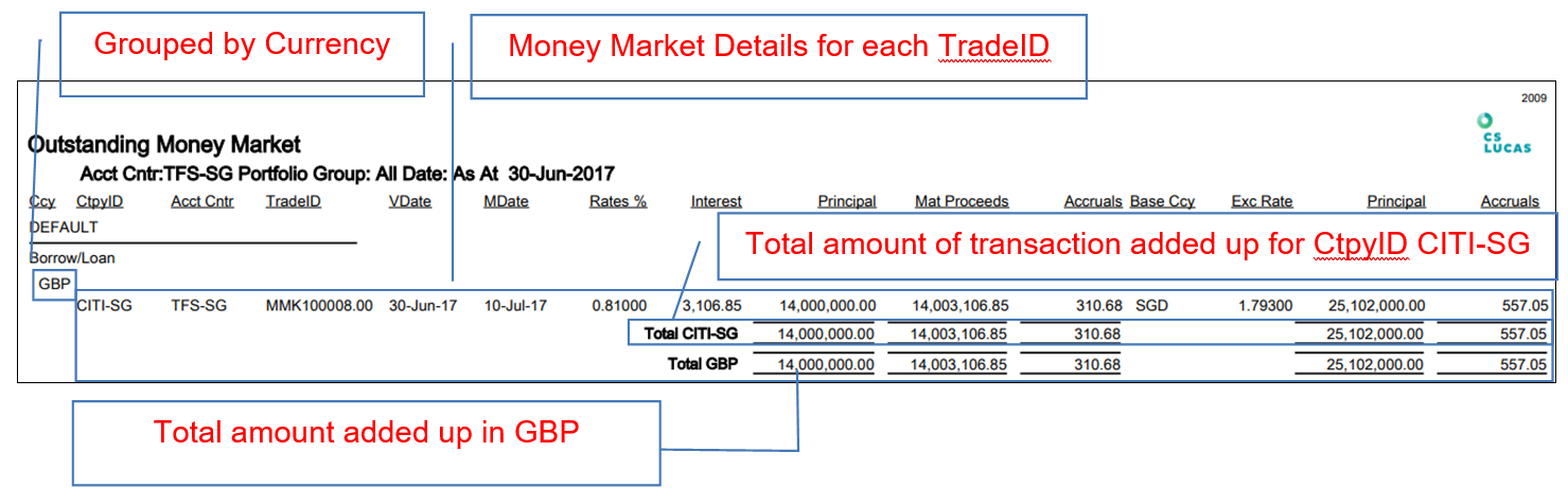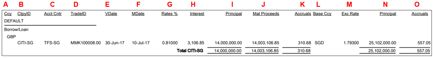 4. The report shows the Currency, Counterparty ID, Accounting Centre, Trade ID, VDate, MDate, Rates, Interest, Principal (Amount), MAT Proceeds (Total Amount with Interest), Accruals, Accounting Centre Base Currency, Exchange Rate, Principal and Accruals in the Base Currency.