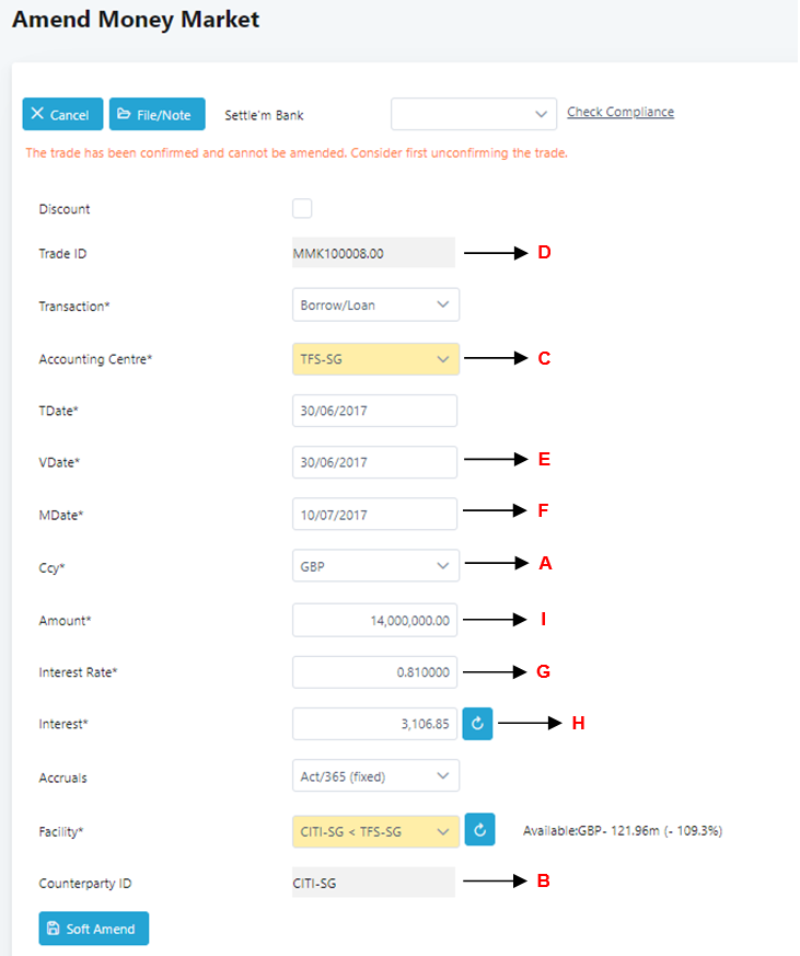 5. Click on the Trade ID (From example: MMK100008.00) to drill down to the Amend Money Market screen.