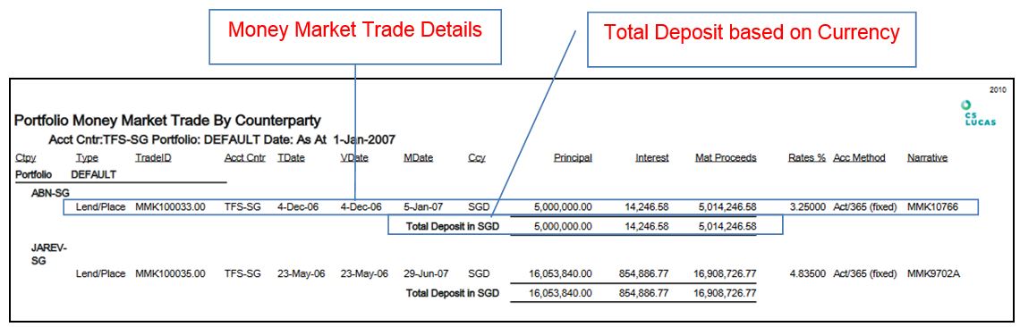 To provide the details used by CS Lucas to show Portfolio Money Market Trade by Counterparty. Allow users to verify the total deposit of each counterparty based on their currency.