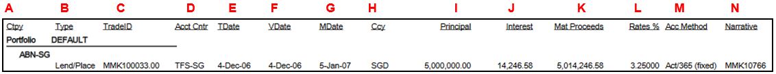 4. The report shows the CounterpartyID, Type, TradeID, Accounting Centre, TDate, VDate, MDate, Currency, Principal (Amount), Interest, Tax, MAT Proceeds (Total Amount with Interest), Rates, Accruals and Narrative.