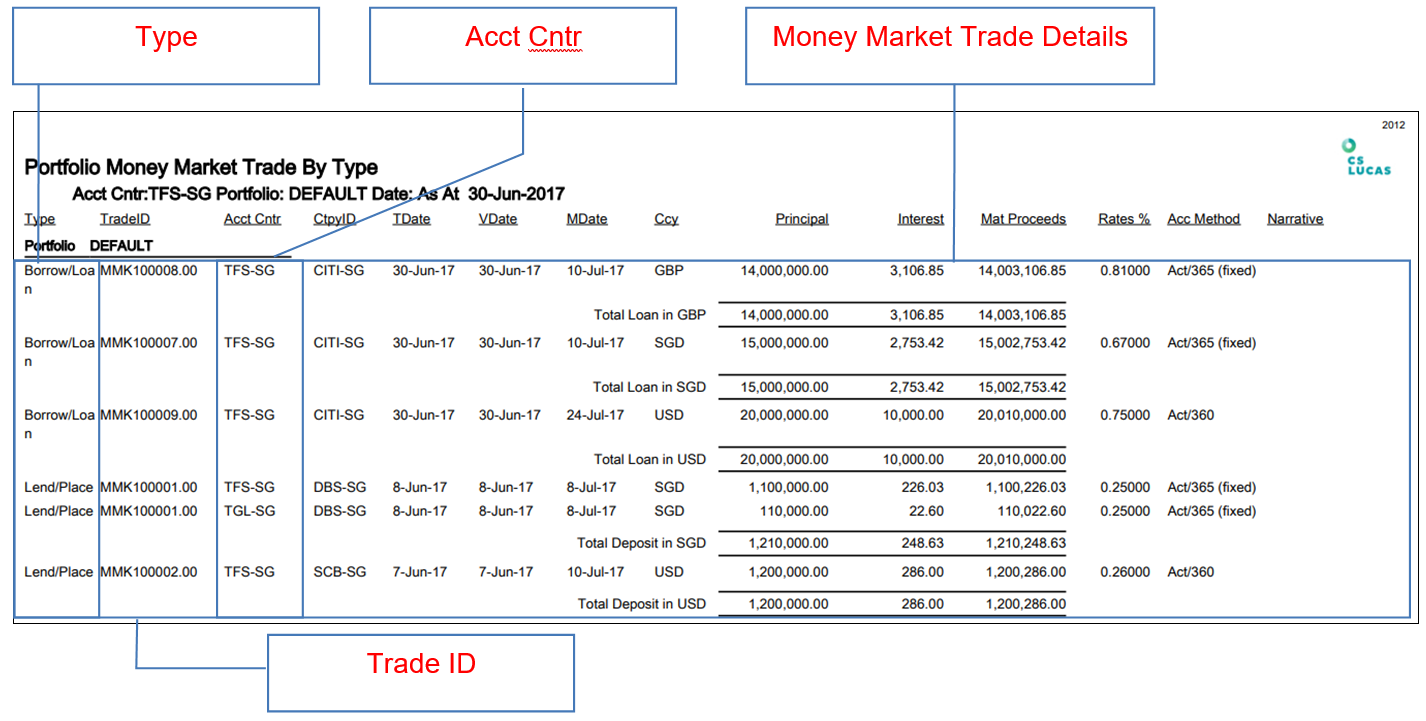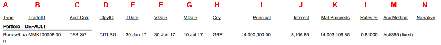 4. The report shows the Type, Trade ID, Accounting Centre, Counterparty ID, TDate, VDate, MDate, Currency, Principal (Amount), Interest, MAT Proceeds (Total Amount with Interest), Rates, Accrual Method and Narrative.