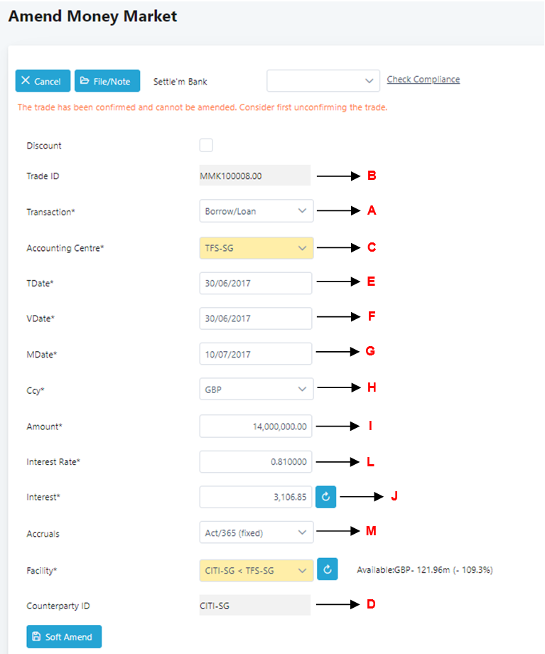 5. Click on the Trade ID (From example: MMK100008.00) to drill down to the Amend Money Market screen.