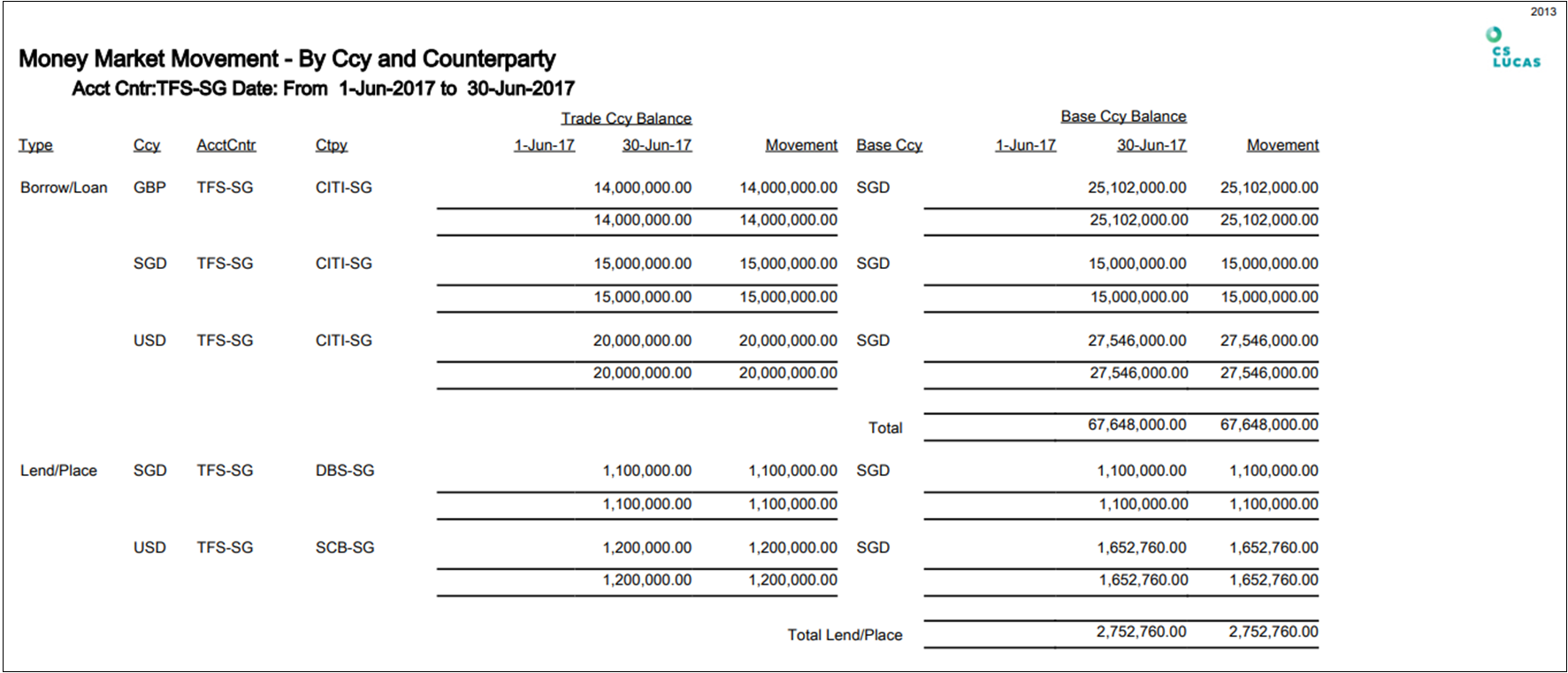 1. Navigate to Reporting > Standard > Report 2013: Money Market Movement – By Ccy and Counterparty.