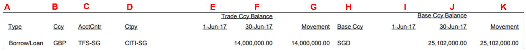 4. The report shows the Type, Currency, Accounting Centre, Counterparty, Trade Ccy Balance and Movement, Base Ccy, Base Ccy Balance and Movement.