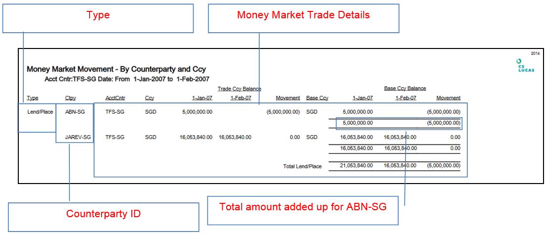 To provide the details used by CS Lucas to show Money Market Movement sort by Counterparty ID and Currency.