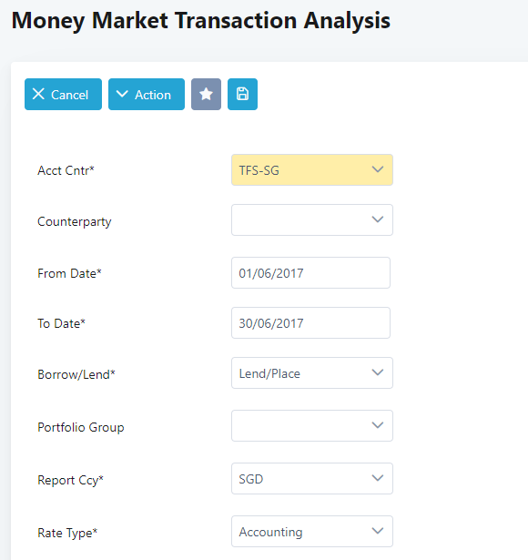 2. Fill in the mandatory parameters – Acct Cntr, From Date and To Date, Borrow/Lend, Report Currency and Rate Type. The rest are optional parameters.