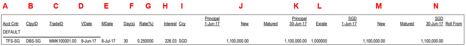 4. The report shows the Accounting Centre, Counterparty ID, Trade ID, VDate, MDate, Days, Rate, Interest, Currency, Principal (Amount), New and Matured.