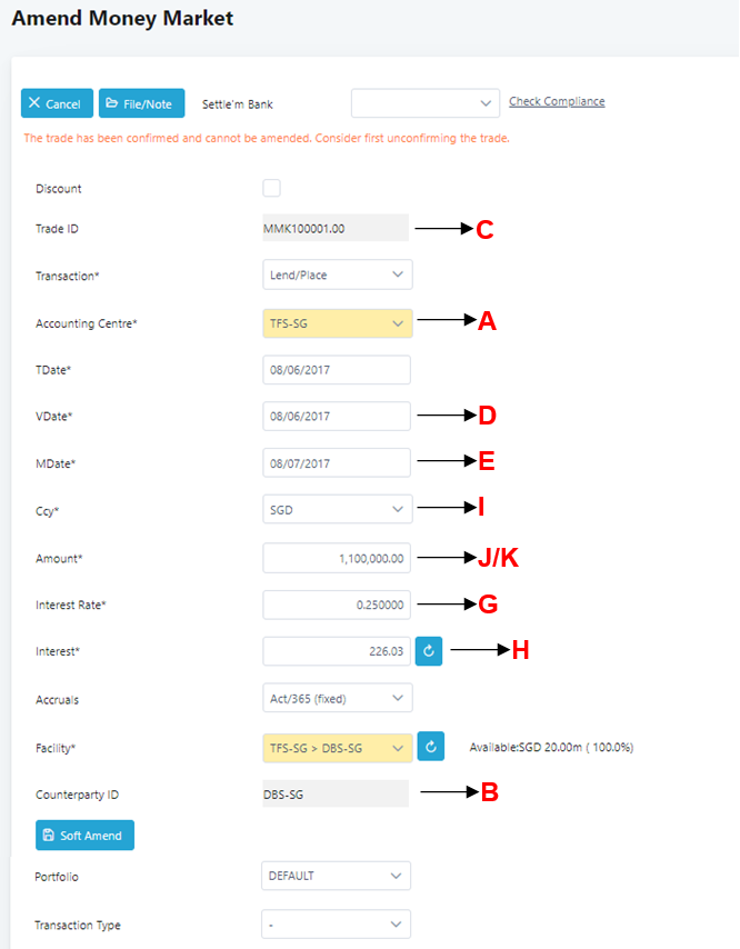 6. Click on the Edit button of the trade (From example: MMK100001.00) to drill down to the Amend Money Market screen.