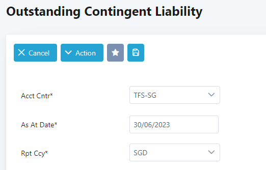 2. Fill in the mandatory parameter – Acct Cntr, As At Date and Report Currency.