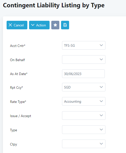 2. Fill in the mandatory parameters – Acct Cntr, As At Date, Report Currency and Rate Type. The rest are optional parameters.