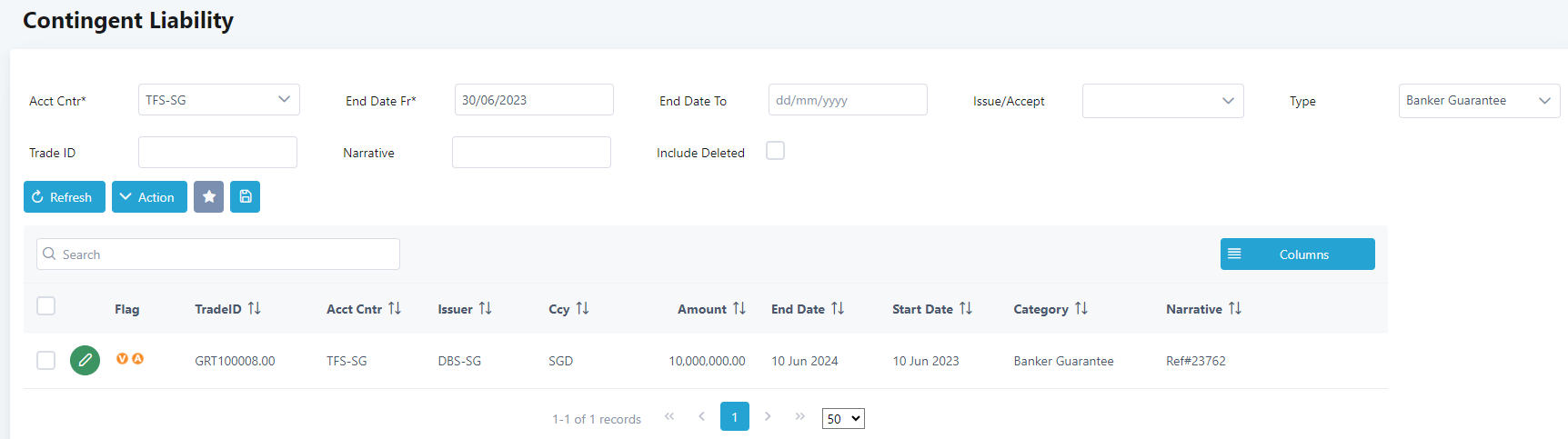 4. The report shows the Type, Accounting Centre, Issue/Accept, On Behalf Of, Trade ID, Counterparty, Counterparty Ref, Type of Guarantee, Beneficiary, Total Start Date Charges, End Date, Claim Date, Trade Currency, Trade Amount, Exch Rate, Rpt Currency, Rpt Currency Amount and Narrative.