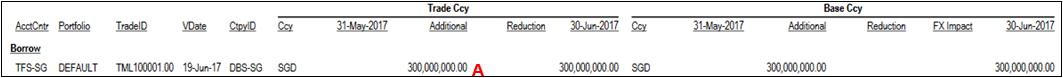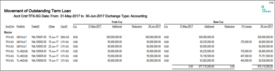 5. TML100001.00 is a loan transaction that start on 19-Jun-2017 (VDate: 19-Jun-2017). Hence, you will see there is additional loan amount under Additional column in the report.