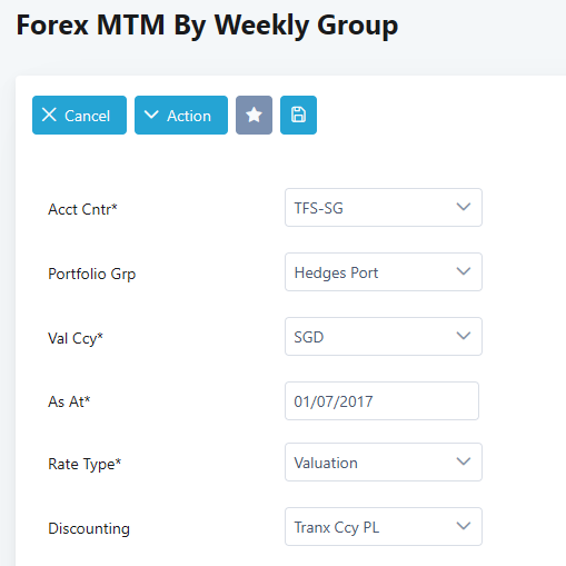 2. Fill in mandatory parameters – Acct Cntr, Val Ccy, As At and Rate Type. The rest are optional parameters.