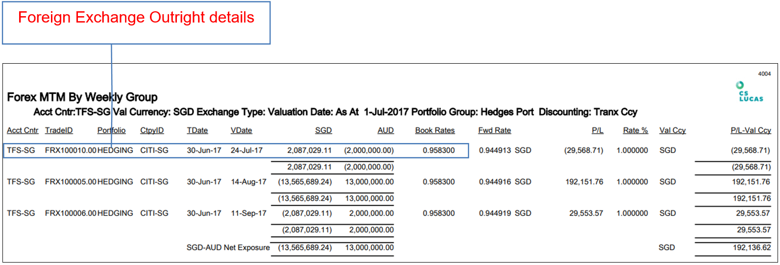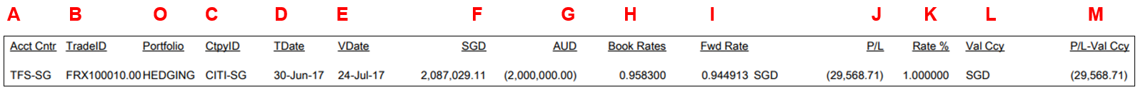 4. The report shows the Accounting Centre, Trade ID, Portfolio, Counterparty ID, TDate, VDate, SGD amount, AUD amount, Book Rates, Forward Rate, P/L, Rate, Val Currency and P/L-Val Ccy.