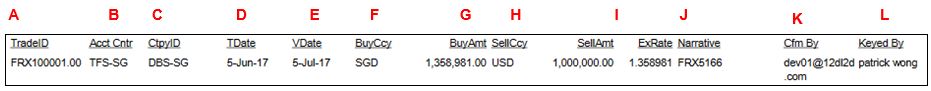 4. The report shows the Trade ID, Accounting Centre, Counterparty ID, TDate, VDate, Sell Currency, Sell Amount, ExRate, Narrative, Confirm By and Keyed By.