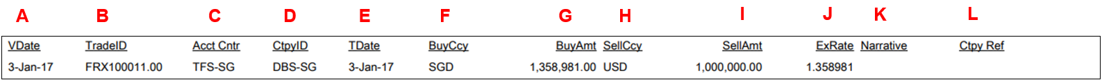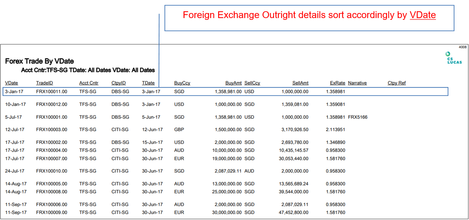 4. The report shows the VDate, Trade ID, Accounting Centre, Counterparty ID, TDate, Buy Currency, Buy Amount, Sell Currency, Sell Amount, ExRate, Narrative and Counterparty Reference.