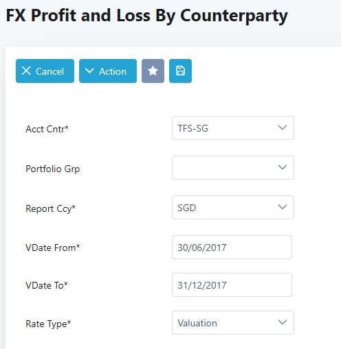 2. Fill in mandatory parameters – Acct Cntr, Report Ccy, VDate From, VDate To and Rate Type. The rest are optional parameters.