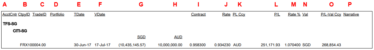 4. The report shows the Accounting Centre, Counterparty ID, Trade ID, Portfolio, TDate, VDate, Contract, Rate, Profit/Loss Currency, Profit/Loss, Rate, Val, P/L-Val Ccy and Narrative.