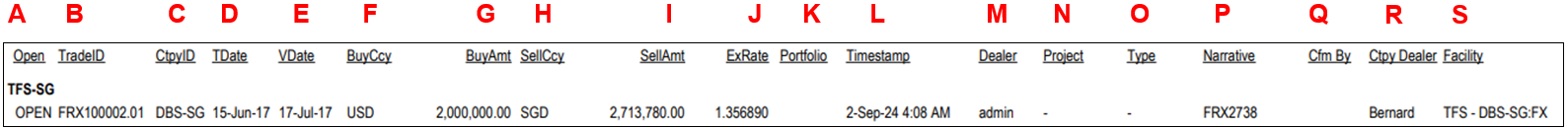 4. The report shows the Open Status, Trade ID, Counterparty ID, TDate, VDate, Buy Currency, Buy Amount, Sell Currency, Sell Amount, ExRate, Portfolio, TimeStamp, Dealer, Project, Type, Narrative, Confirm By, Counterparty Dealer and Facility.