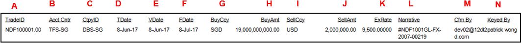 4. The report shows the Trade ID, Accounting Centre, Counterparty ID, TDate, VDate, FDate, Buy Currency, Buy Amount, Sell Currency, Sell Amount, Ex Rate, Narrative, Confirm By and Keyed By.