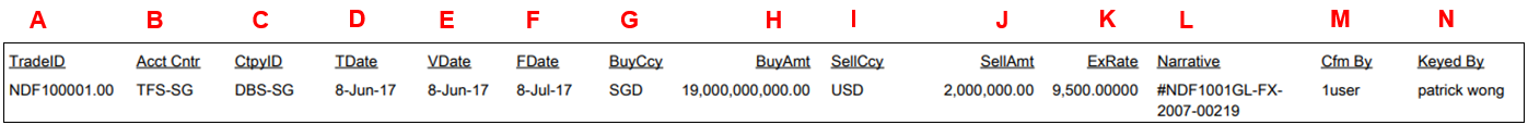 4. The report shows the Trade ID, Accounting Centre, Counterparty ID, TDate, VDate, FDate, Buy Currency, Buy Amount, Sell Currency, Sell Amount, Ex Rate, Narrative, Confirm By and Keyed By.