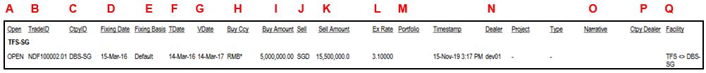 4. The report shows the Trade ID, Counterparty ID, Fixing Date, TDate, VDate, Buy Currency, Buy Amount, Sell Currency, Sell Amount, Ex Rate, Portfolio, Timestamp, Dealer, Project, Type, Narrative, Ctpy Dealer and Facility.