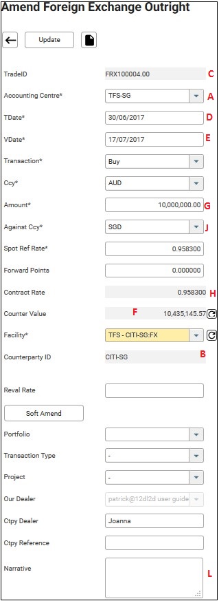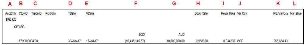 4. The report shows the Accounting Centre, CtpyID, Trade ID, Portfolio, TDate, VDate, Ccy, Amount in SGD, Amount in USD, Book Rate, Reval Rate, Val Currency, P/L-Val Ccy, and Narrative.