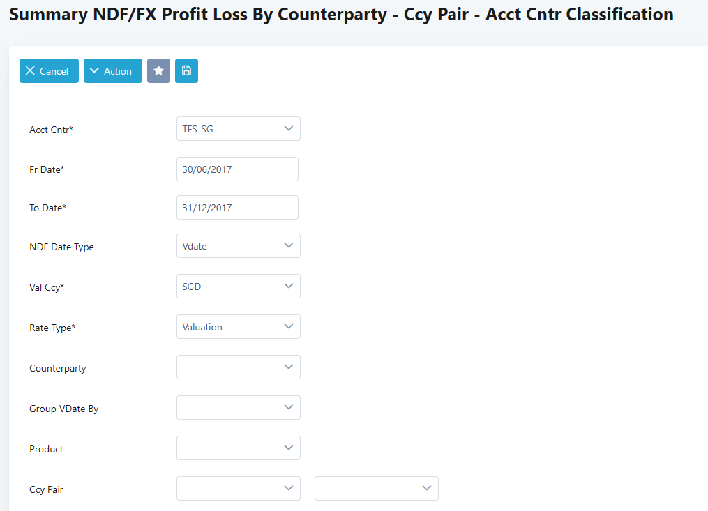 Allow users to verify the details of Summary NDF/FX Profit Loss By Counterparty – Ccy Pair – Acct Cntr Classification.