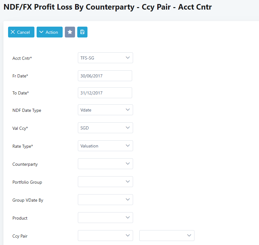 2. Fill in the mandatory parameter – Acct Cntr, Fr Date, To Date, Val Ccy and Rate Type.