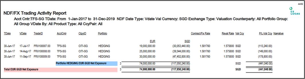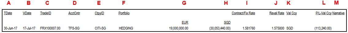 4. The report shows the TDate, VDate, Trade ID, Accounting Centre, Counterparty, Portfolio, Currencies, Contract/Fix Rate, Reval Rate, Val Ccy, P/L Val Ccy and Narrative.