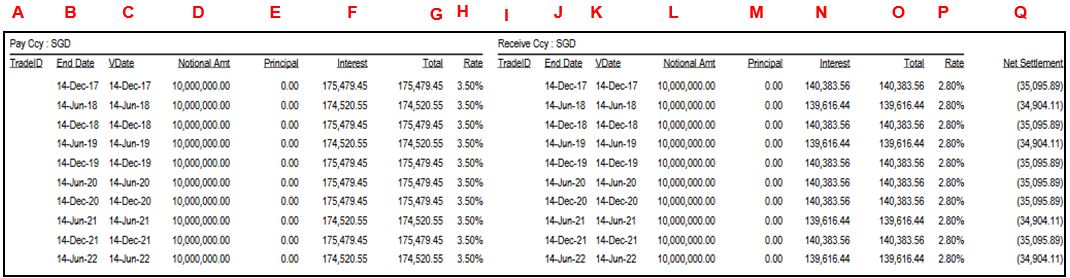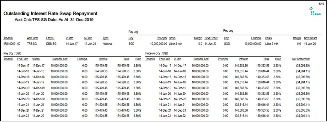 4. The report shows the Trade ID, Accounting Centre, Counterparty, VDate, MDate, Type, Pay Leg Currency, Principal, Basis, Margin and Next Reset, Receive Leg Currency, Principal, Basis, Margin and Next Reset, Pay and Receive Currency Repayment Details.